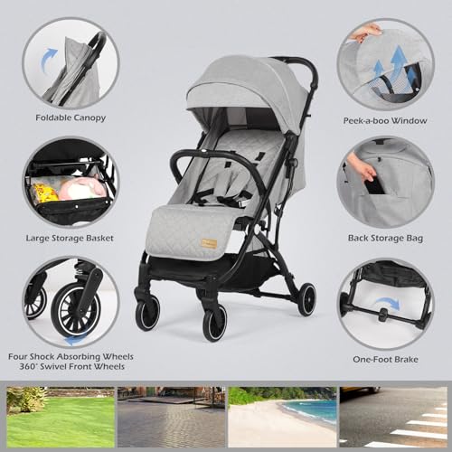 Baby Stroller Pushchair, One-Hand Foldable Compact Travel Stroller Buggy with Rain Cover&Mosquito Net, Lightweight Baby Pram with 5-Point Harness, Adjustable Seat and Large Basket, 0-15KG, Light Grey