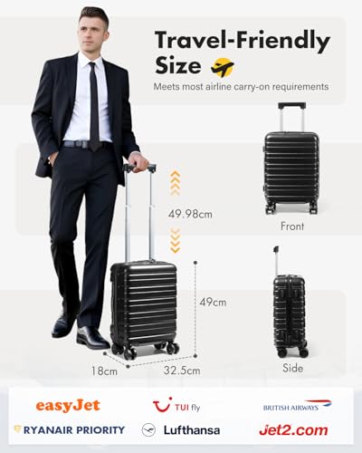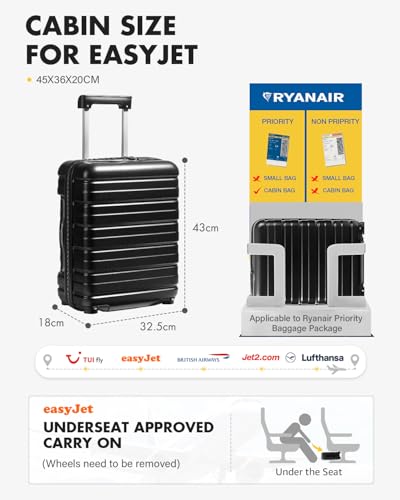 Compatibility: This black carry-on suitcase is designed for easyJet flights(needs to be removed wheels), measuring 43×32.5×18 cm to fit their maximum size. It comfortably fits under the seat in front of you, avoiding extra charges and providing maximum flexibility for your travels