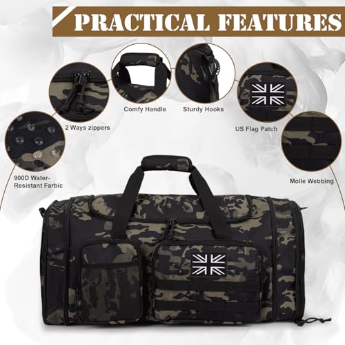 Military Grade Water Resistant Fabric Tactical duffle bag constructed from 900D water-resistant material with 2 smooth zippers, resisting wear and tears. Padded handles and 33-60in adjustable shoulder strap (with sturdy hooks) ease carrying strain. Independent shoes compartment features air vents to prevent odor, while the back PVC-lined wet bag isolates damp items. duffle bag for men, its rugged materials and thoughtful details tackle any environment.