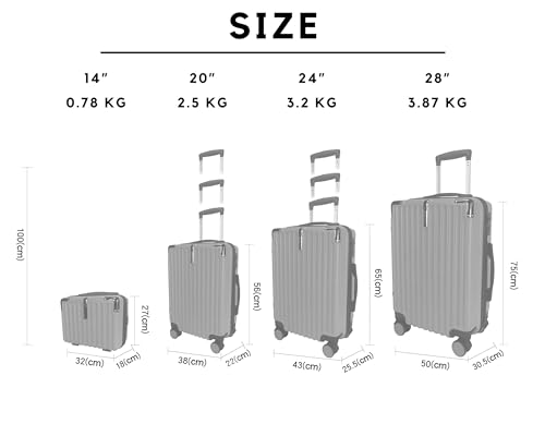 4 Piece Set – 14″ Hand Bag: 27 x 32 x 18 CM – Small Cabin Size : 20″ – 56 x 38 x 22 CM – Medium Size :24″ – 65 x 43 x 26 CM Large Size : 28″ – 75 x 50 x 31 CM