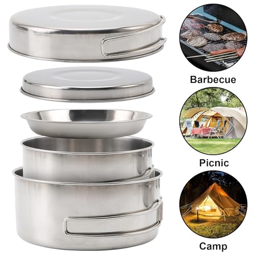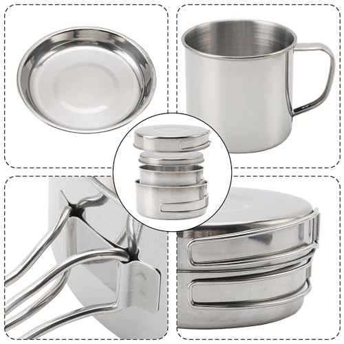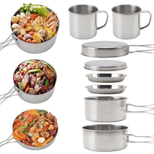 SANON 8pcs Camping Cookware Set 2-3 People, Camping Pan Pot Set with Cup and Tableware, Portable Stainless Steel Cook Gear, Foldable Outdoor Traveling Cooking Utensils Kit, for Picnic, Trekking
