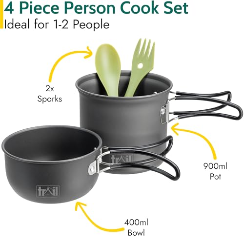 1-2 PERSON CAMPING COOK SET (4pc): Cook up a storm on camping trips with this 1-2 Person Camping Cookware Set from Trail. Lightweight and stackable with a bag to easily carry, it includes two cooking pots which are suitable for gas camping stoves. Plus, two sporks which you can use as utensils for cooking and cutlery for dishing up and dining.