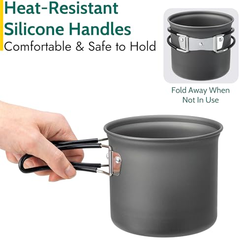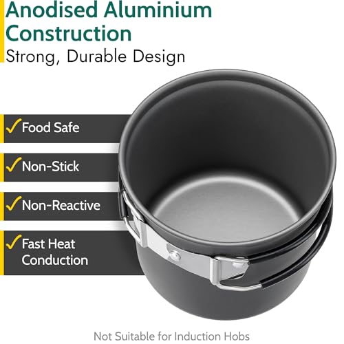 2 x HARD ANODISED COOKING POTS: Cookware set includes a 400ml cooking pot and 900ml cooking pot for versatile cooking. Made from lightweight aluminium with a hard anodised coating for superior strength and durability. Non-stick, safe for direct food contact, and excellent at conducting heat for faster, easier cooking. Plus, easy to clean.