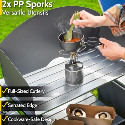 STACKABLE WITH MESH CARRY BAG: Pop the sporks inside the large cooking pot, then place the small cooking pot on top. Once stacked, place the set inside the mesh bag included, which has a cord to keep everything secure. Compact and lightweight, the set measures 17cm x 12.5cm x 12.5cm and weighs 0.26kg when stored inside the bag.