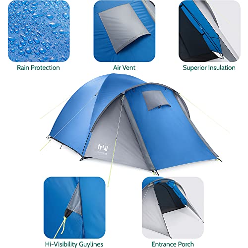 Trail Bracken 3 Man Tent With Porch, 3000mm Waterproof Rating, Double Skin Dome Tent with Darkened Bedroom, Lightweight for Camping and Festivals, Bag Included (320cm x 210cm x 130cm)