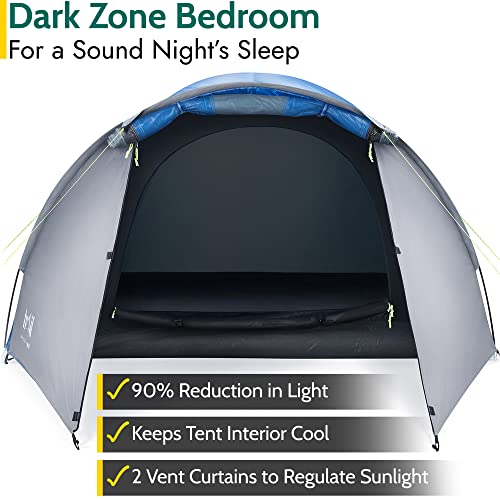 EXCLUSIVE DARK ZONE BEDROOM: Dark Zone Bedroom blocks out up to 70% more light than older models to enhance the quality and length of your sleep. The technology also allows the tent to absorb less sunlight which helps to keep it cooler in warmer weather. Vents with removable curtains on the roof and door allow you to let light in when needed.