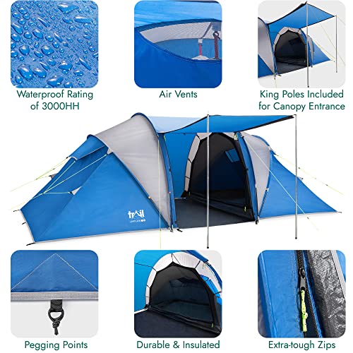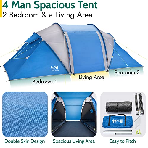 Trail Hartland 4 Man 2 Room Tent With Living Area and Awning, 3000mm Waterproof Rating, Tunnel Tent with Dark Zone Bedroom Technology, Family Camping, Bag Included (420cm x 210cm x 140/115cm)
