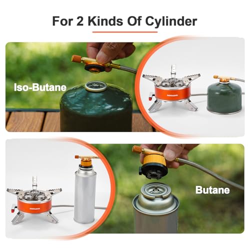 Compatible with Different Canister: Equipped with 1 kind of adapter, perfect for 2 different gas cylinders. Compatible with any 7/16 thread single propane/butane-propane mixed fuel canisters (EN 417). The 65cm lengthen gas pipe make it safer to stay away from the gas canister. Backpacking stove can be used with gas tank and firewood.