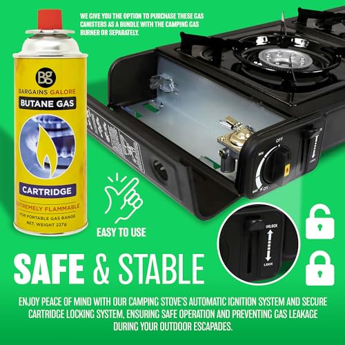 ✔️ SAFE & STABLE – Its automatic ignition system ensures safe and easy operation, and the ultra-lightweight design makes it easy to take on the go. The stove’s cartridge locking system ensures that the gas cartridge is securely clipped into gas stove camping, preventing any gas leakage. Furthermore, Our Butane gas is of superior quality and is packaged in secure metal container bottles to ensure safety.