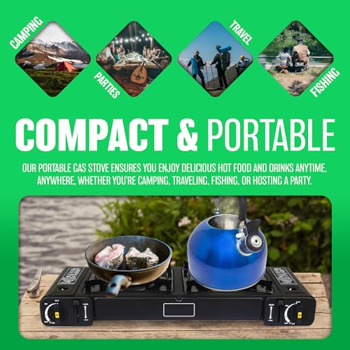 ✔️ ELEVATING YOUR EXPERIENCE – Our portable gas stove is lightweight, and safe that allows you to enjoy delicious hot food and drinks anytime and anywhere. Perfect for outdoor camping, travel, fishing, and parties, this versatile mobile kitchen is a must-have for anyone looking to elevate their outdoor dining experience.