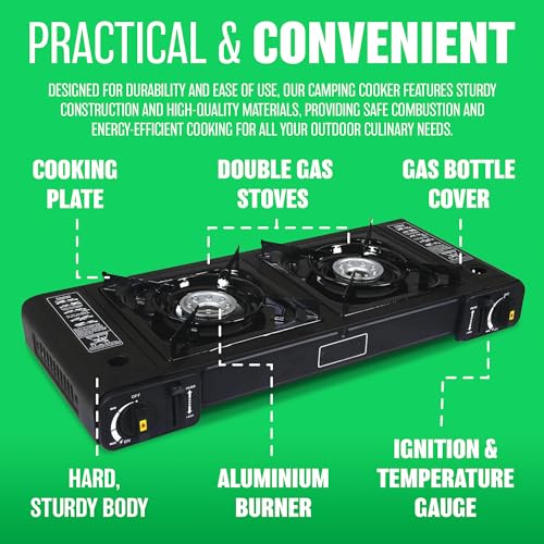 Portable Double Gas Cooker Stove – For Outdoor Camping, Hiking, Fishing, Skiing Trips, Caravan & BBQ, Party | Premium Burner, Automatic Ignition & Heater Control, EN417 Compliant – Black Grill