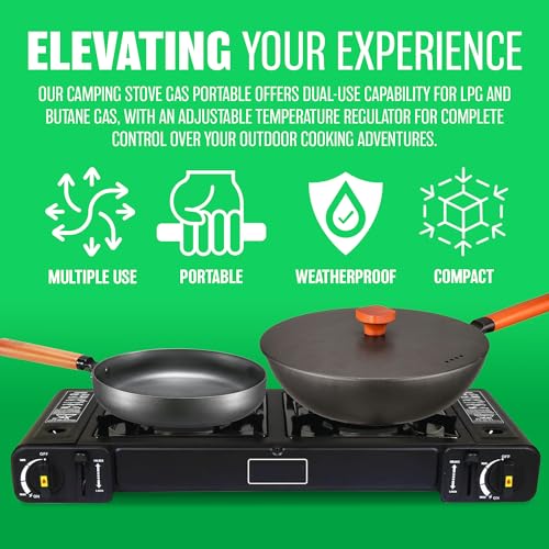 ✔️ SIMPLE AND EASY – The camping stove gas portable is easy to use and versatile with its dual-use capability for LPG and Butane Gas. With Its adjustable temperature regulator which provides complete control over the flame, you can easily cook a variety of dishes for your camping or outdoor excursion.