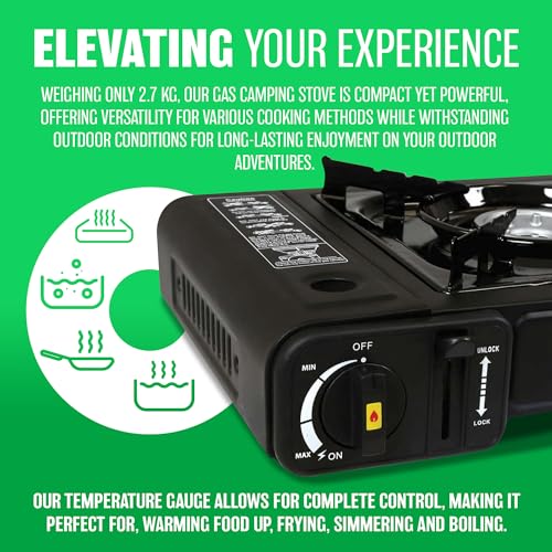 ✔️ COMPACT & PORTABLE – Gas camping stove is lightweight around 2.7 kg, small size. The stove is versatile and can be used for various cooking methods, such as boiling, simmering, and frying, making it a great addition to any outdoor kitchen. Designed to be durable and long-lasting, with high-quality materials used to withstand outdoor conditions and repeated use.