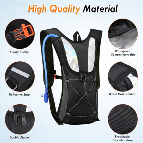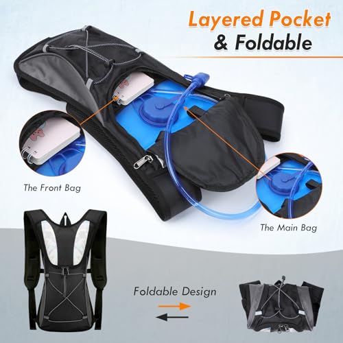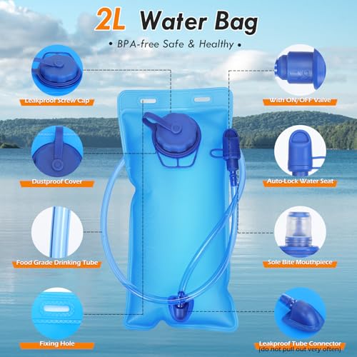 【2L Hydration Bladder】Our hydration backpack comes with a 2L water bladder. The water bladder is made of high quality polyester material, BPA-free and FDA-approved, coming in taste-free, pressure-tolerant and leak-proof. Hands-free drinking tube with suction cup mouthpiece, gently bite to let the water flow, drink water by the tube directly without taking your running vest off or stopping your steps.