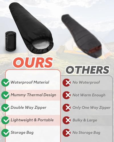 DESIGNED FOR COLD WEATHER ADVENTURES: This sleeping bag for adults is engineered for temperatures ranging from -5°C to 15°C, making it ideal for camping, hiking, or any outdoor activities. The sleeping bags are crafted with waterproof, weather-resistant materials to keep you warm and dry even in extreme conditions. Perfect for camping sleeping bags or as a lightweight sleeping bag for your outdoor escapades.