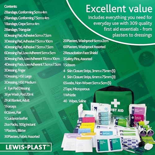 Lewis-Plast First Aid Kit Bag – 309 Piece Survival Kits – Safety Essentials for Travel Car Home Camping Work Hiking,Green
