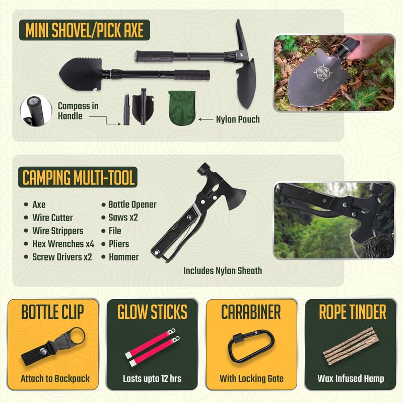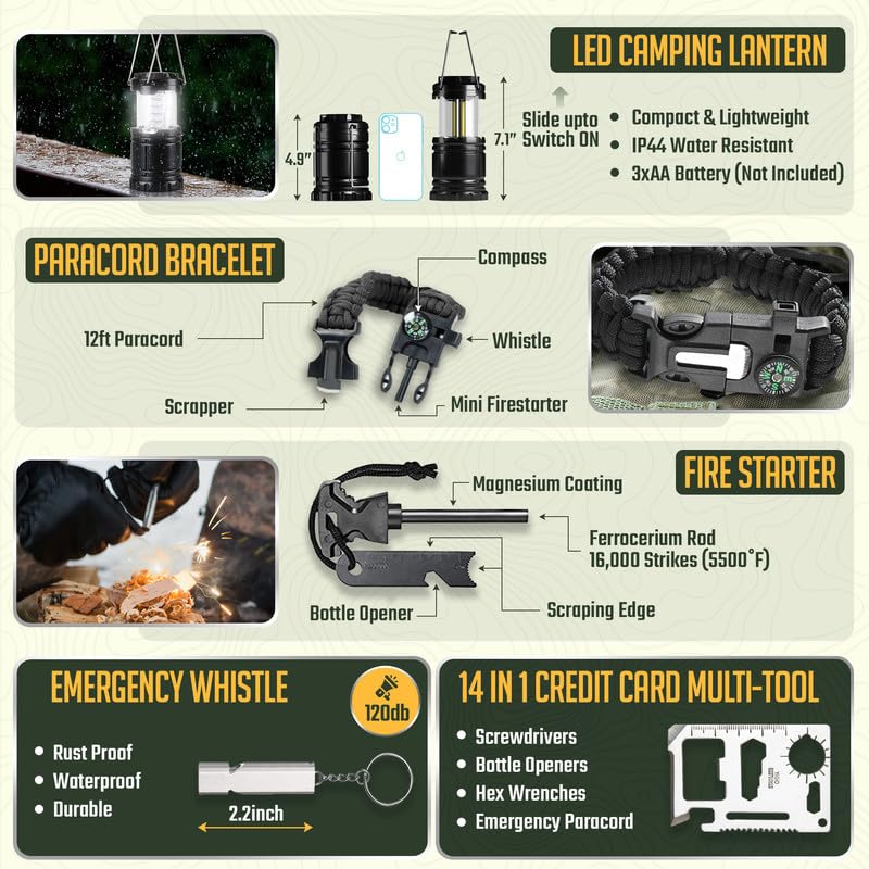 COMPREHENSIVE KIT: 214-piece outdoor survival and first aid kit equipped with essential tools for fire-starting, warmth, navigation, fishing, and signalling, perfect for camping and trekking adventures.