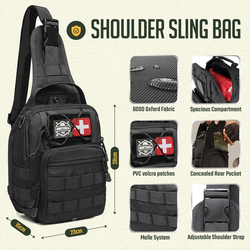 DURABLE STORAGE: 11L tactical sling bag made from robust 600D oxford fabric, water-resistant and spacious enough for all included gear plus personal items.