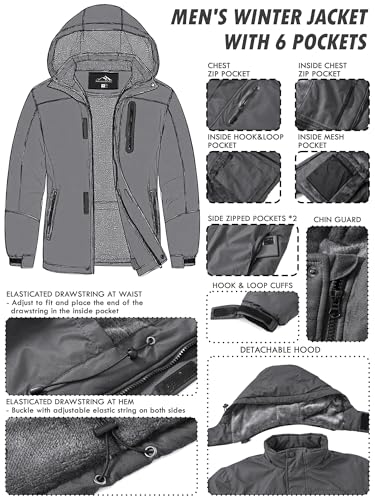 Men’s Waterproof Mountain Hiking Jacket Outdoor Warm Fleece Winter Coat with Removable Hood
