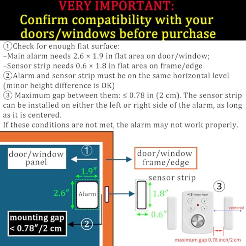 VERY IMPORTANT: Confirm compatibility with your doors/windows before purchase: Check for enough flat surface: –① Main alarm needs 2.6 × 1.9 in flat area on door/window; –② Sensor strip needs 0.6 × 1.8 in flat area on frame/edge; –③Alarm and sensor strip must be on the same horizontal level(minor height difference is OK); –④Maximum gap between them: ≤ 0.78 in (2 cm). If these conditions are not met, the alarm may not work properly.