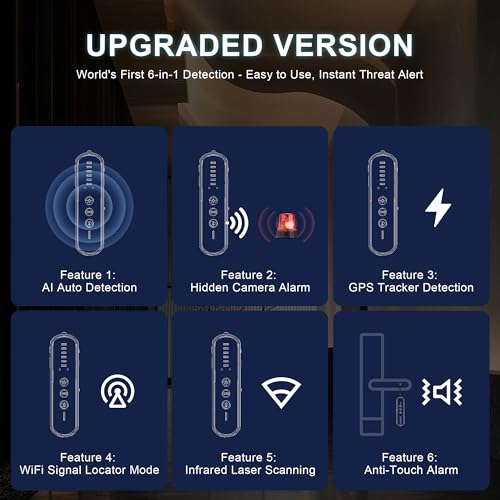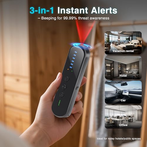 【3-in-1 Alerts – See, Feel & Hear Threats】This anti-spy detector provides 3-way alerts: LED flashes, strong vibrations and sound beeps. Perfect for noisy hotels or quiet sweeps, it reliably finds hidden cameras, listening devices and trackers in rooms, cars or offices.
