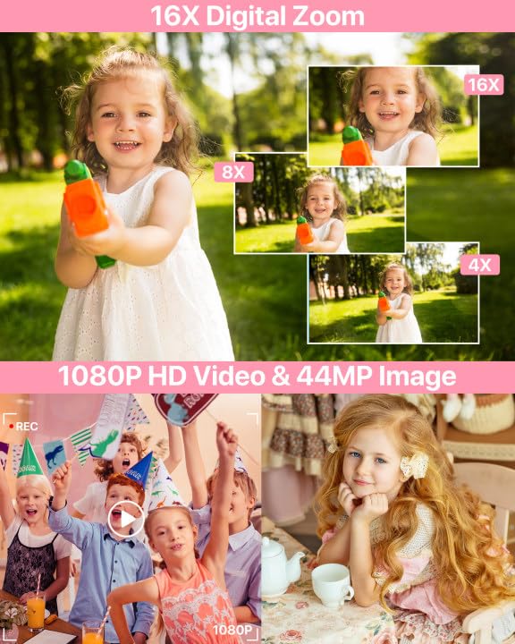FHD 1080P & 44MP Image & 16x Digital Zoom: This digital camera delivers exceptional image quality with an impressive 44MP resolution and smooth 1080P Full HD video recording. This pink digital camera offers 16x digital zoom. When recording videos or taking still photos, you can press the W/T button to zoom in or out on the subject, easily capturing details of distant scenes.