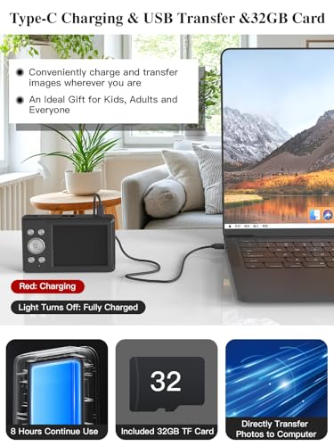 【Very Easy To Use 】Conducted with ergonomic design, from easy to access buttons to simple functions menu, user-friendly interfaces down to the large LCD display, a 5-13 years kid can easily figure out. You can effortlessly transfer your images from the digital camera to your computer, just use the included USB data cable to connect the camera to the computer. It also included a 32GB TF card to make sure you have enough storage space.