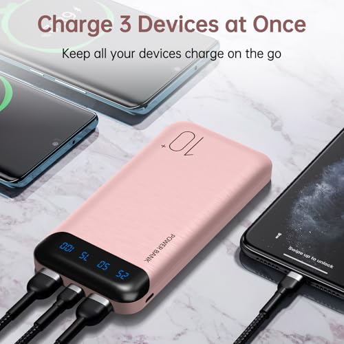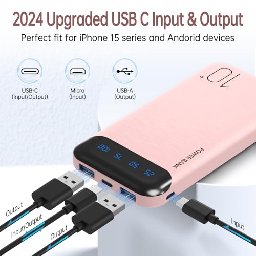 Portable Charger 10000mAh Slim USB C Input and Output Power Bank with LED Display Lightweight External Battery Pack Compatible for iPhone 14/13/12, iPad, Samsung etc. (pink)