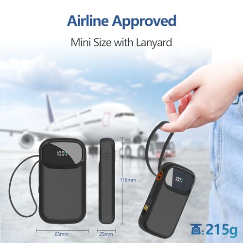 ⚡【Pocket Size But Powerful】The Power bank just 3.6 x 3.23 x 0.7 inches and weighing only 6.87 Oz/195g. 10000mAh portable phone battery pack charge iPhone 14 1.8 times and Samsung S23 1.5 times. It has an adjustable USB Input cable, pull out for recharging, pull back for easy carrying or hanging on backpack. It’s perfect size to put in the purse, briefcase, pocket, backpack or glovebox of the car and it doesn’t weigh that much and take up too much room.