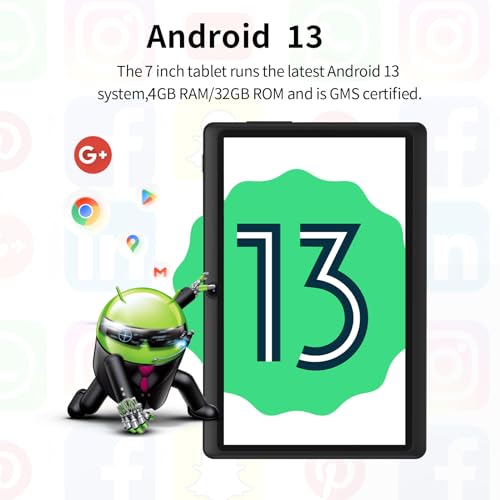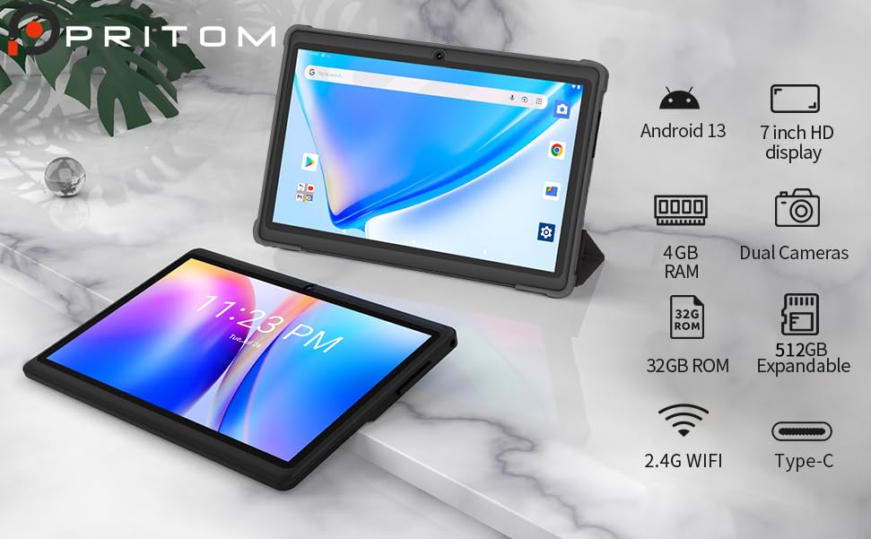 PRITOM 7 inch Android Tablet 32 GB, (Expandable 512GB),3500 Mah, Android 13,Tablet with Quad Core Processor, Bluetooth,Dual Camera,WiFi, Portable Tablets PC with Black Case