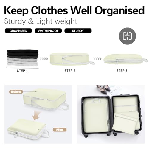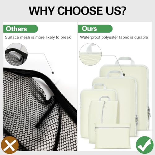 Compression Packing Cubes for Suitcases,Suitcase Organiser Bags,Travel Packing Cubes Compression Set for Backpack,Packing Organisers,Waterproof Travel Organiser Packing Bags (Beige, 5 Pack)