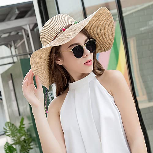 Adrinfly Women Foldable Floppy Wide Brim Straw Sun Hat Travel Packable Adjustable Summer Beach Accessories Hat UV UPF 50+, Khaki, One Size